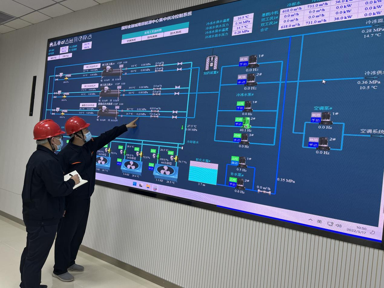 目前,济南国际金融城南部能源中心全力按下生产运行“加速键”,在做好设备巡检及风险隐患排查的同时,铆足干劲争分夺秒提高运行进度,通过多部门协作调动人手、严控运行人员流动、强化运行人员监管管理等措施,采用人对点、专人专管等措施覆盖各个制冷站,确保南部能源中心集中供冷安全作业。