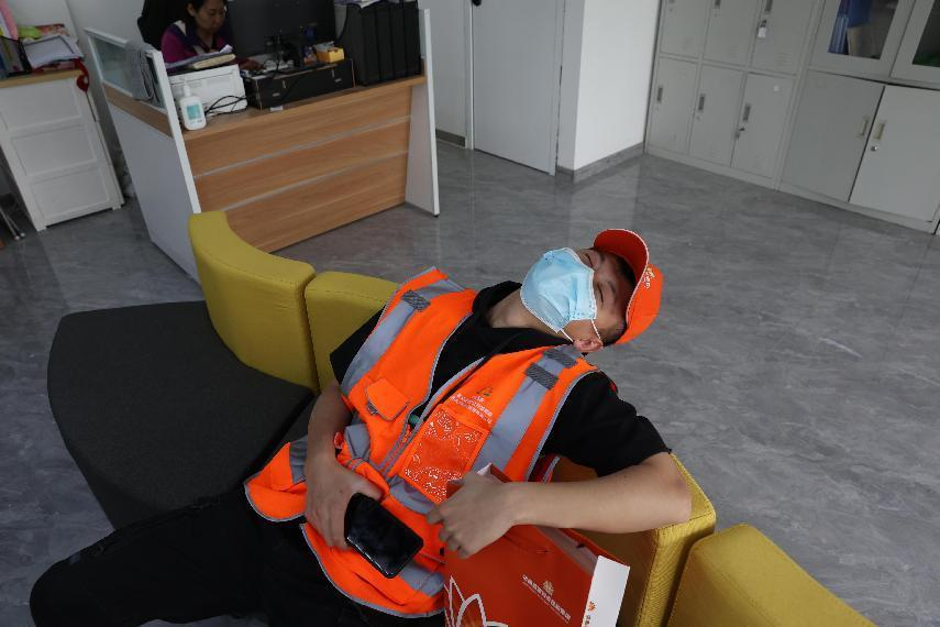 “书记,这边防疫物资已准备齐全,马上送至社区。”青年团员徐纪伟放下电话,立刻将载有医用护目镜、医用手套、防护服、口罩、消毒液、桌椅、帐篷、马甲等2000余件物资送到杆石桥街道各个社区,一天下来往返数十余趟,完成任务后身心俱疲的他倒在沙发上睡着了。