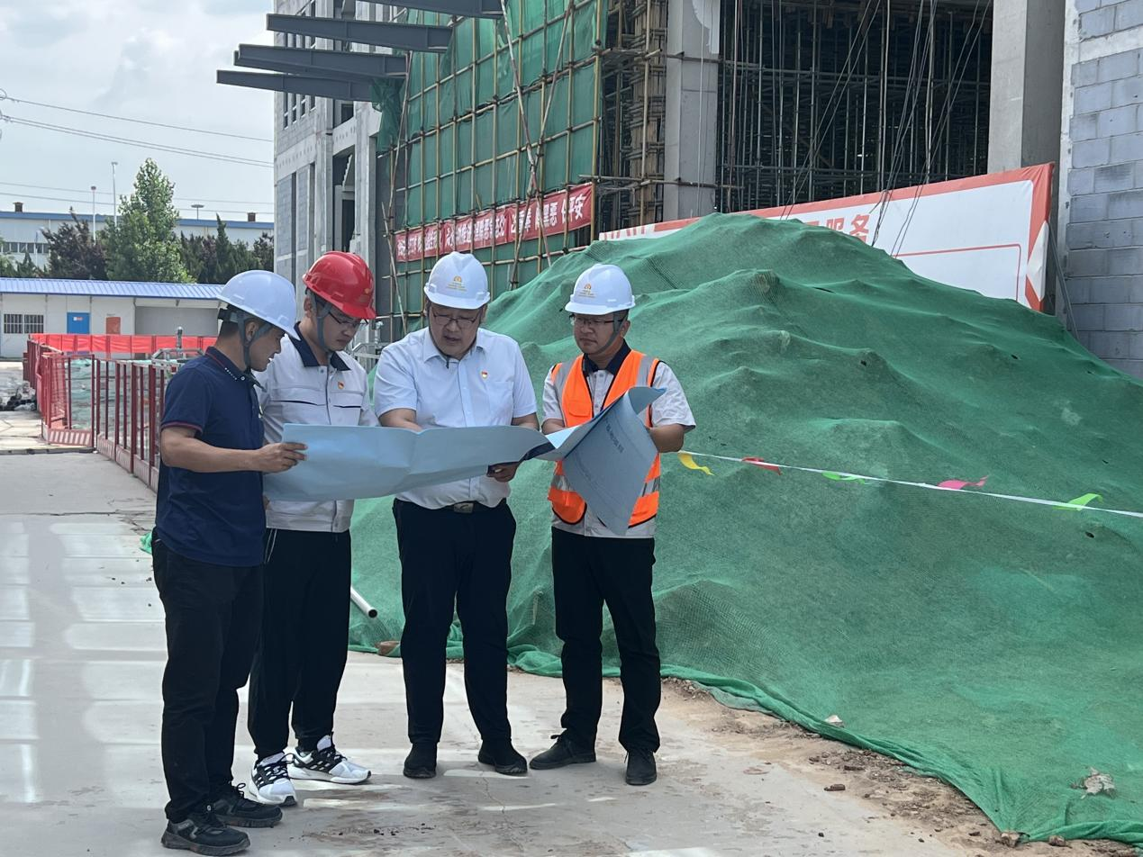夏日蝉鸣、焊花飞溅、连墙接栋……山东和同信息科技股份有限公司智能制造中心项目正如火如荼建设中。和同信息公司党员酆烽、刘太山、侯伟与山东泰山建工发展集团有限公司党员刘宝组成四人“攻坚CP”,一同巡视施工现场,交流施工进度、施工质量、安全防护等情况,整个工地一派生机勃勃的景象。